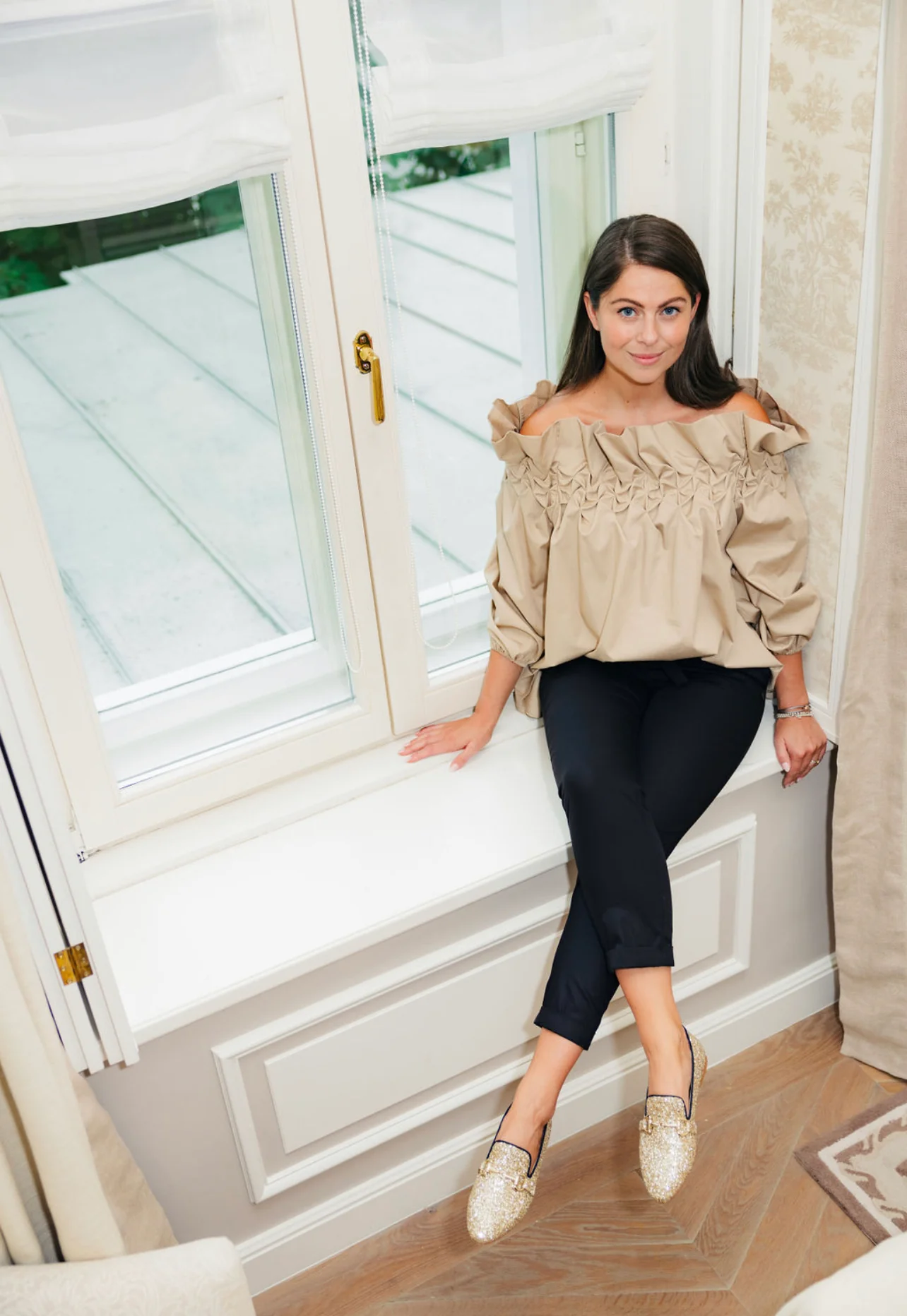 Goldene Glitzer Loafer mit goldener Trense und dunkelblauer Ripsband-Einfassung