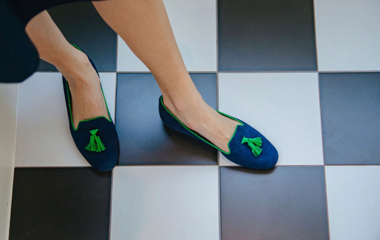 Obermaterial: 100% dunkelblaues Wildleder mit grünem Tassel