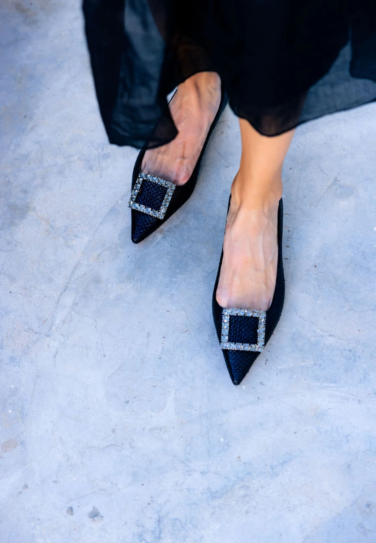 Spitzer Loafer aus schwarzem Bast mit silberner Strass-Applikation